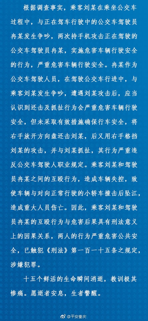深圳新聞網(wǎng)11月5日訊(記者 張玲)2018年10月28日10時08分,重慶市萬州區(qū)長江二橋發(fā)生重大交通事故,一輛大巴車在行駛中突然越過中心實線撞上一輛正常行駛的紅色小轎車后墜江。重慶公交墜江事故的原因經(jīng)“平安重慶”發(fā)布后,全民熱議。因乘客劉某坐過站引發(fā)與司機冉某的口角進而爭執(zhí)升級,最終導(dǎo)致悲劇發(fā)生,公交車失控沖入江中,全車乘客殞命。廣東卓建律師事務(wù)所律師高級合伙人于智亮律師接受記者采訪時強調(diào),暴力干擾司機正常駕駛的行為涉嫌以危險方法危害公共安全罪。