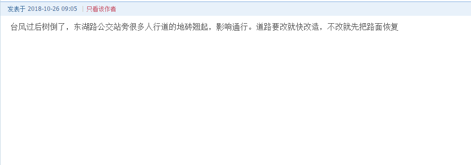 “再補(bǔ)一張,到2019年啦?!痹摼W(wǎng)友在發(fā)帖后的幾小時(shí)內(nèi),又補(bǔ)發(fā)了一張寫有“2019年實(shí)施,2019年完工”的截圖。并配圖表示“臺(tái)風(fēng)過去快2個(gè)月了,東湖路的人行道石磚仍大片凸起,地鐵站前面的道路凹凸不平,從來沒有人來處理?!?/p>