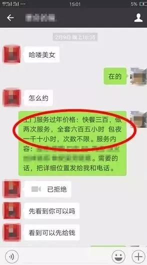 受害人看到招嫖信息主動聯系時,騙子立即承諾服務內容,讓受害人悠然神往,喪失理智。