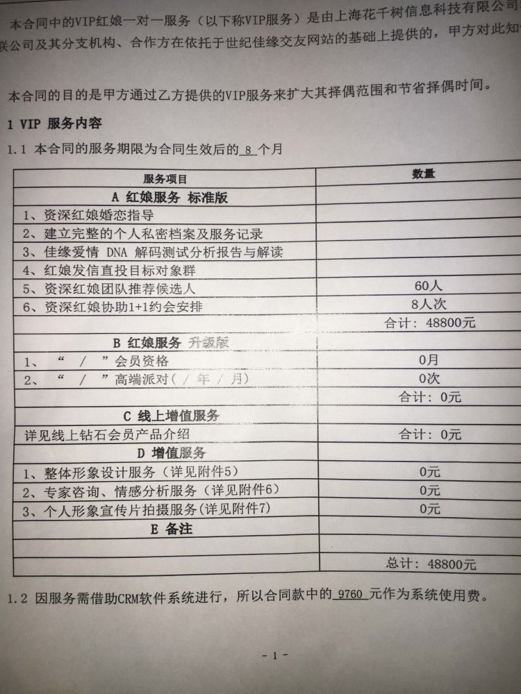 今年2月27日,劉小姐與世紀(jì)佳緣簽訂了一份繳款4.88萬的紅娘服務(wù)合同。合同服務(wù)期限為8個月,合同將根據(jù)其擇偶標(biāo)準(zhǔn),由系統(tǒng)推薦60位候選人,其中紅娘協(xié)助線下約會安排8人次。此外,合同還包含三項增值服務(wù),包括整體形象設(shè)計,專家咨詢、情感分析服務(wù)和個人宣傳片服務(wù)。