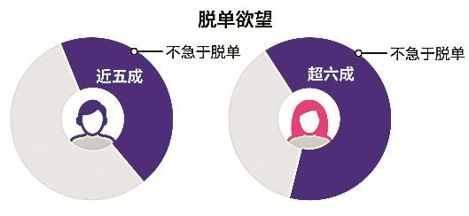 調(diào)查顯示,在脫單欲望方面,近五成單身男性和六成單身女性表示不急于改變單身狀態(tài)??梢?jiàn),單身男女的脫單欲望正在逐漸下降。
