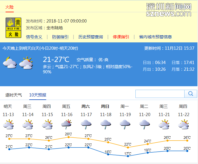 記者從深圳市氣象局了解到,11日夜間到12日白天,深圳市多云間陰天;早晨最低氣溫22-23℃,東部及山地地區(qū)氣溫會低1-2℃;白天最高氣溫在28-30℃;相對濕度在45%-95%;偏北風2-3級,沿海和高地最大陣風4-5級;全市能見度普遍在5-15公里左右。火險預(yù)警信號生效中。