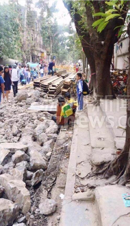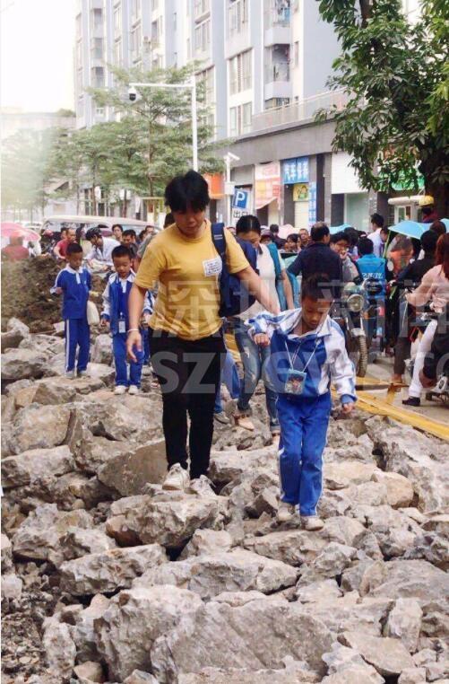 另有網(wǎng)友跟帖表示:同學(xué)們求學(xué)路坎坷,看得揪心!從現(xiàn)場圖可以看到,學(xué)生上下學(xué)都要穿過工地。路面被挖開,道路邊上只留下很窄的一條小道。上下學(xué)高峰期,成群結(jié)隊的學(xué)生在碎石穿行,旁邊小道上行人、三輪、電動單車堵成一鍋粥,存在很大的安全隱患。
