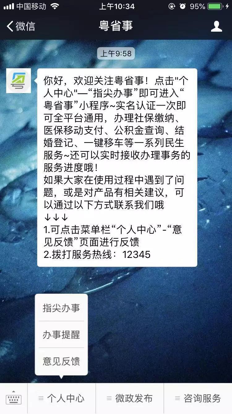 1、關注“粵省事”公眾號,點擊菜單欄“個人中心”-“指尖辦事”