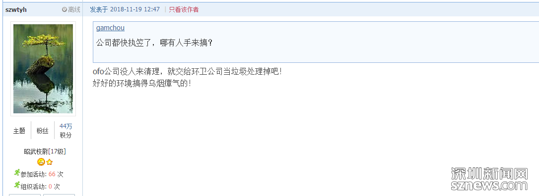 “福田河的水質(zhì)很好,但大量的故障單車停放在路邊實在是煞風(fēng)景。”網(wǎng)友“szwtyh”認為,不應(yīng)該讓這些單車礙了深圳的城市景觀,掃了市民欣賞福田河水的興致。