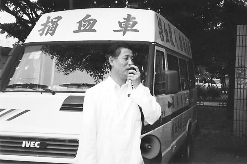 1995年5月7日,捐血車第一天開上街頭,血站老站長楊春森拿著擴音器大嗽叭向市民宣傳。 余海蓉 攝