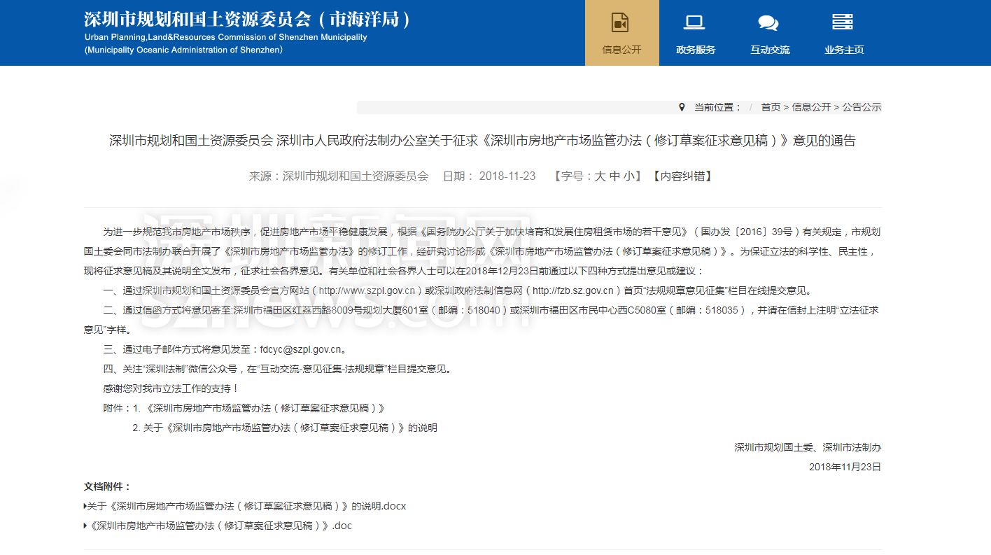 深圳新聞網(wǎng)11月24日訊(記者 張玲)深圳市房地產(chǎn)行業(yè)將取消年檢制度,改為年報(bào)制度、銷售價(jià)格以數(shù)據(jù)共享方式備案、預(yù)售條件為完成地面以上三分之一層數(shù)、房地產(chǎn)開發(fā)企業(yè)不得拒絕購房人使用住房公積金貸款、人均租住建筑面積不得低于6㎡……實(shí)施已有8年的《深圳市委房地產(chǎn)市場監(jiān)管辦法》要修訂了,11月23日,深圳市人民政府法制辦和深圳市規(guī)土委同時(shí)在官網(wǎng)發(fā)布通告,就修訂后的草案征求社會(huì)公眾意見。