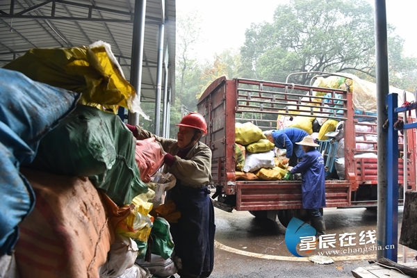 (白箬鋪鎮(zhèn)分揀回收總站的工作人員正對(duì)村里轉(zhuǎn)運(yùn)來(lái)的垃圾進(jìn)行分類。)