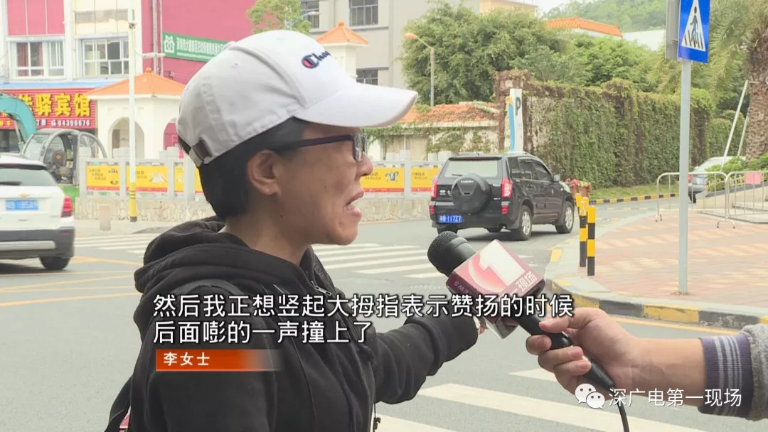 正當(dāng);李女士要贊揚(yáng)他時(shí),這輛小汽車被后面的電動(dòng)車追尾了