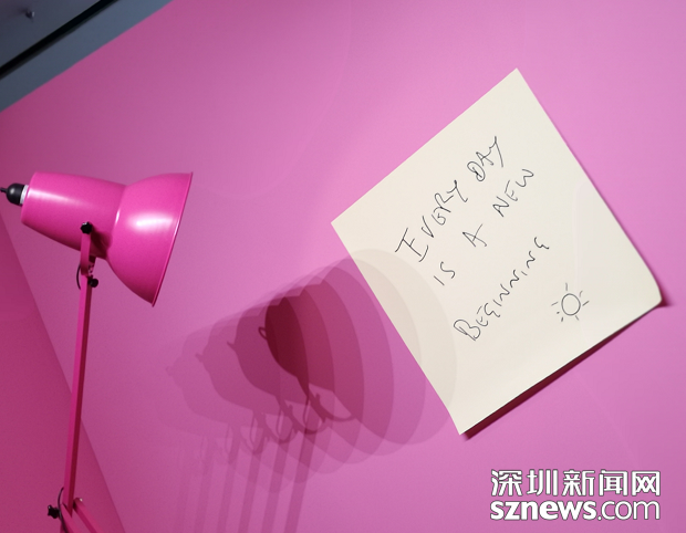 Anglepoise是英國經(jīng)典的臺燈設(shè)計,Paul Smith先生以他的英式幽默,將它依比例放大成巨型臺燈,并涂上了展覽主色系的粉紅色,背景再加上 Paul Smith先生最喜愛的便利貼 EVERY DAY IS A NEW BEGINNING,在展覽出口作為對每位觀眾最后的謝禮。