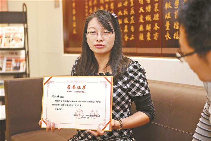 “近期,我剛剛加入了深圳市福田區(qū)作家協(xié)會(huì)?!眲⒐鹬楦嬖V記者,她從高中的時(shí)候就喜歡寫作?!昂髞?,我來深圳打工之后,不管工作多忙多累,這個(gè)愛好都沒有間斷過,一直堅(jiān)持到現(xiàn)在。它已經(jīng)成為我生命中的一部分了,可以說是一種生活習(xí)慣?!?/p>