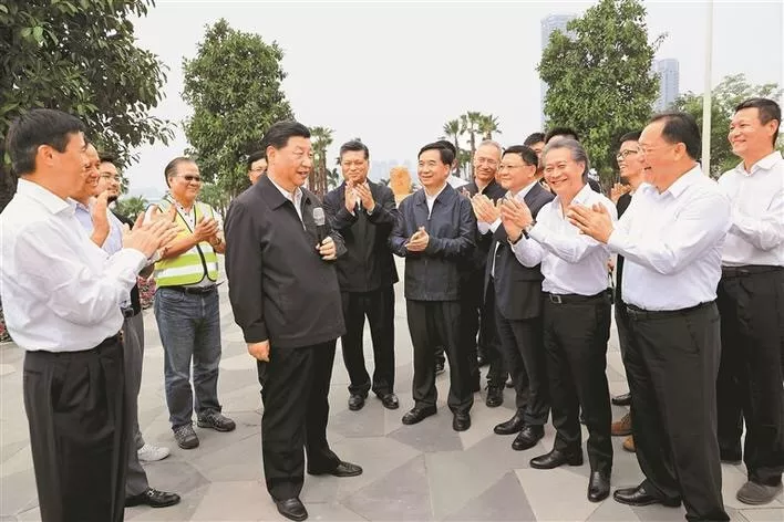 10月24日,習(xí)近平在廣東自由貿(mào)易試驗(yàn)區(qū)深圳前海蛇口片區(qū)考察。在前海石前,習(xí)近平同前海建設(shè)者和見(jiàn)證者代表同話滄桑巨變。新華社記者鞠鵬攝