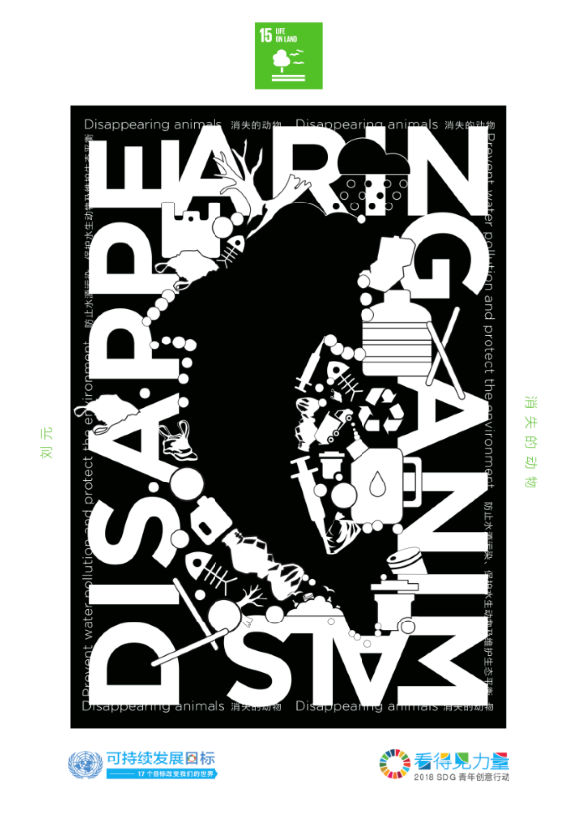 作品解釋 /隨著工業(yè)社會(huì)的飛速發(fā)展,我們面對(duì)的環(huán)境問(wèn)題越來(lái)越嚴(yán)重,特別是人類的伙伴-動(dòng)物更是面臨著各種環(huán)境問(wèn)題在不斷減少,作品以Disappearing animals為主題結(jié)合水、陸、空三種類型動(dòng)物為代表,以生活垃圾、破壞及殺害動(dòng)物等各種因素為設(shè)計(jì)元素,巧妙結(jié)合為正負(fù)圖形概念來(lái)傳達(dá)海報(bào)主題,黑白視覺(jué)、傳達(dá)危機(jī)。