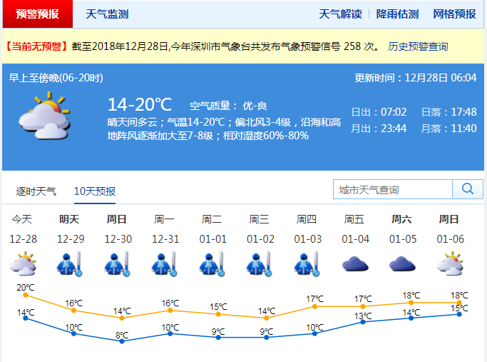 深圳市氣象局預(yù)計,12月28日受冷空氣前鋒影響,我市多云間晴天,風(fēng)力加大,沿海和高地最大陣風(fēng)7-8級,氣溫下降,早晚清涼;29日-元月2日受冷空氣主體影響,氣溫顯著下降,天氣持續(xù)寒冷,最低氣溫在8℃左右,伴有7-9級陣風(fēng),間中有小雨。寒冷天氣將持續(xù)5-6天。