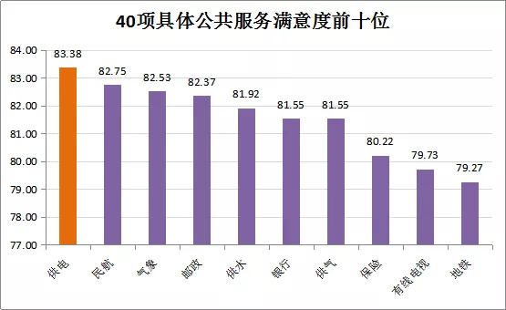 在40項具體公共服務(wù)中,公眾對供電服務(wù)的滿意度依然最高,得分為83.38分,連續(xù)十年位居全省40項政府公共服務(wù)第一位,廣州、深圳、中山等21個地市供電服務(wù)的滿意度也均位列各市公共服務(wù)首位。空氣污染治理(70.16分)、垃圾回收與處理(69.37分)、水環(huán)境治理(68.46分)、污水處理(68.42分)、噪聲控制效果(67.43分)的滿意度較低。