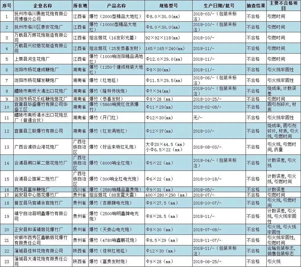 ③國(guó)家市場(chǎng)監(jiān)管總局日前組織開(kāi)展煙花爆竹產(chǎn)品質(zhì)量國(guó)家監(jiān)督專(zhuān)項(xiàng)抽查,共抽查6個(gè)省(自治區(qū))150家企業(yè)生產(chǎn)的150批次產(chǎn)品,檢出23批次不合格,不合格發(fā)現(xiàn)率為15.3%。