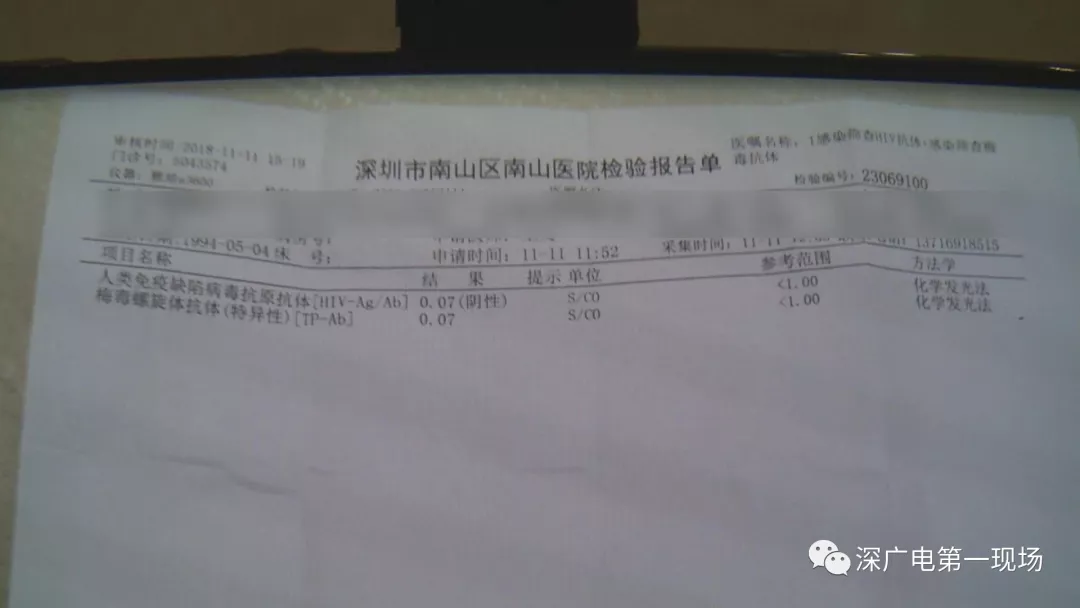 隨后,記者撥打吳某的電話,對報料人所說的情況進行核實。電話中吳某告訴記者說他的病已經(jīng)治好了,并且給記者發(fā)來一張2018年11月11日,南山醫(yī)院的檢驗報告單。
