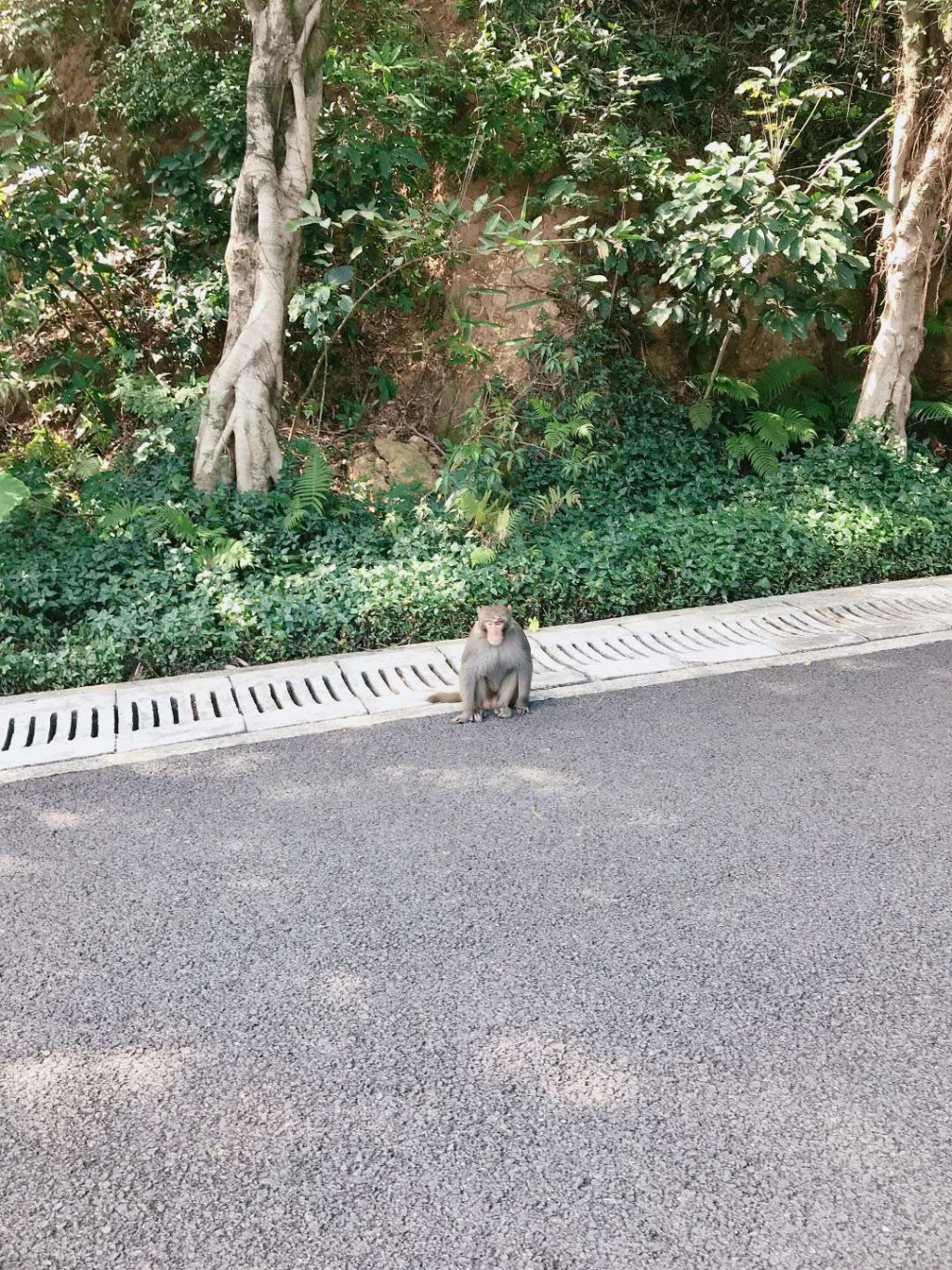 "這個東西很聰明,愛吃蘋果、香蕉和糖果,估計有三四十斤重,很肥。"今天上午,記者前往梅林山公園探訪猴子的蹤影。從梅山苑二期的梅林山公園入口一上公園主干道,記者就發(fā)現(xiàn)保安員陳先生正在路邊值守,梅林山公園管理處發(fā)現(xiàn)猴子后,就安排了保安員巡查看護。陳先生告訴記者,20日早上7點多猴子就出現(xiàn)在路邊,當時公園人少,沒有討到吃的就走了。上午10點多,乘著游玩的人多猴子又跑出來湊熱鬧,保安員發(fā)現(xiàn)后拿了香蕉、橘子和糖果給它,猴子也一點不客氣,從人手里接過來就吃。原本靜謐的公園隨著猴子的出現(xiàn)熱鬧起來,圍觀的市民也紛紛慷慨解囊。這只胖乎乎的猴子一點也不怕人,最近時距離人不到一米遠,大家也親切叫它"肥仔"。