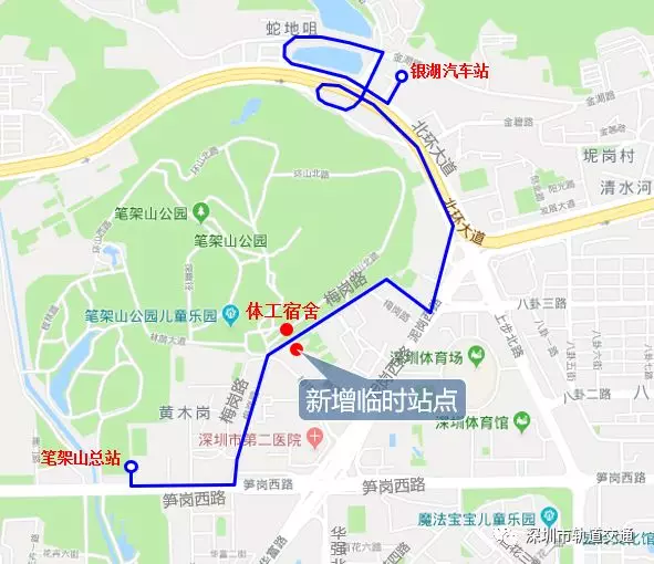 (1)新增筆架山總站-銀湖汽車(chē)總站聯(lián)系線路,線路雙向途經(jīng)筍崗路、梅崗路、泥崗西路、北環(huán)大道。停靠銀湖汽車(chē)站(銀湖地鐵站)、體工宿舍、市二醫(yī)院①(黃木崗地鐵站)、筆架山總站。(詳見(jiàn)圖5)