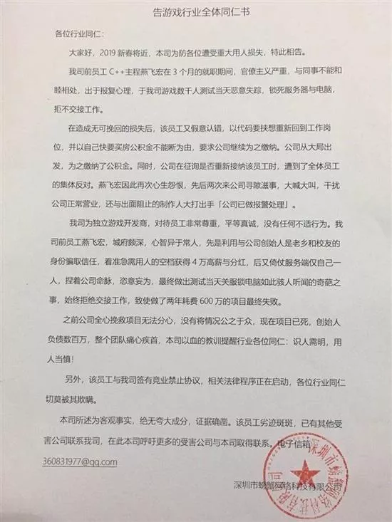 從微博大V“首席內(nèi)幕官”曬出的信息顯示,涉事程序員名叫“燕飛宏”,依仗服務(wù)端僅自己一人,捏著公司命脈,恣意妄為,在游戲測(cè)試當(dāng)天關(guān)服鎖電腦,拒絕交接工作,致使做了2年耗費(fèi)600萬元的項(xiàng)目最終失敗。