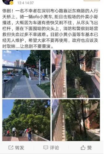 原標(biāo)題:羅湖一路人騎共享單車飛落天橋墜亡,深圳交警公布事故原因