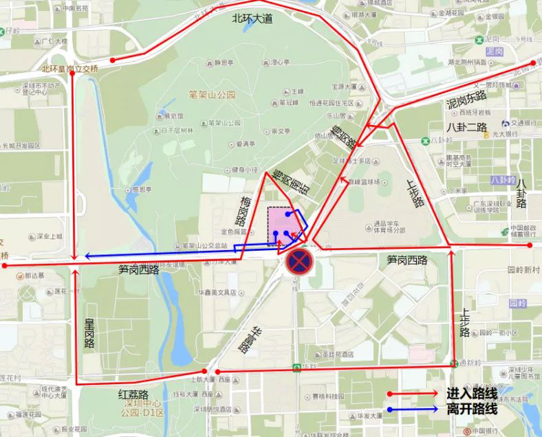 原經筍崗西路東行 -黃木崗立交掉頭往醫(yī)院交通調整為:筍崗西路 -梅崗路 -梅崗南街。