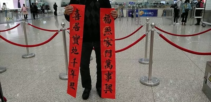宋先生當(dāng)天10:50的飛機(jī)出發(fā)去上海再轉(zhuǎn)機(jī)回老家山東,他選擇了“人和家順百事興,富貴平安福滿堂”橫批“家和業(yè)興”,一個(gè)個(gè)“家”“安”“和”等字樣表達(dá)了他的新年愿望:希望家人平平安安。