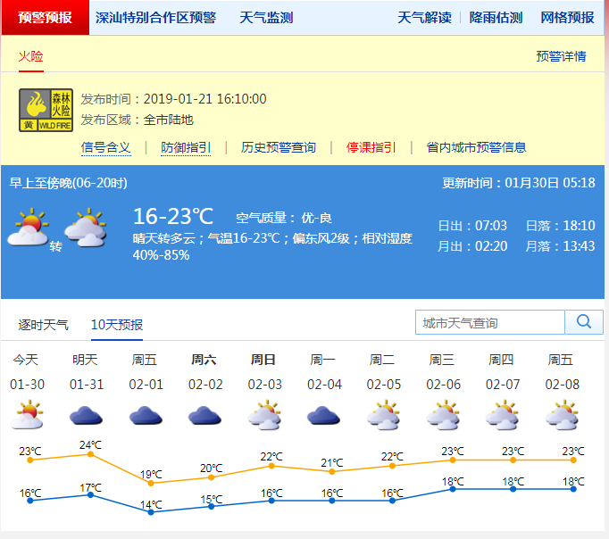 深圳新聞網(wǎng)2019年1月30日訊 深圳今日天氣多云,氣溫16-23℃,東風(fēng)2-3級,相對濕度40%-80% ;31日多云轉(zhuǎn)陰天,偶有零星小雨;2月1日受冷空氣影響,有分散小雨,沿海和高地最大陣風(fēng)7級,氣溫下降,天氣轉(zhuǎn)涼;2-3日多云,早晚有輕霧,氣溫上升;4-5日陰天間多云,有輕霧和短時(shí)小雨。