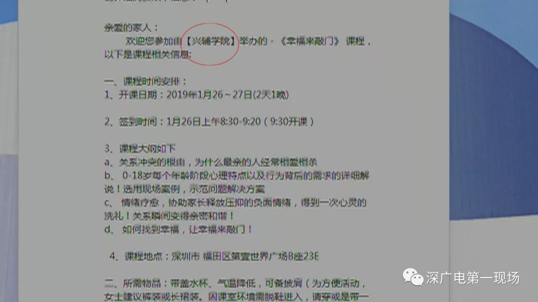 深廣電第一現(xiàn)場2019年2月1日訊 寒假前夕,龍華區(qū)不少家長向我們欄目反映,從上學期開始他們通過學校老師的介紹,接觸到了一個教育機構(gòu)。這個校外的培訓機構(gòu),主要給家長傳授親子教育和家庭相處的技巧,按說這應(yīng)該是一件好事,可是一些家長卻發(fā)現(xiàn),參加了一些課程之后,不光家庭關(guān)系沒有變好,反而帶來了不少家庭矛盾?