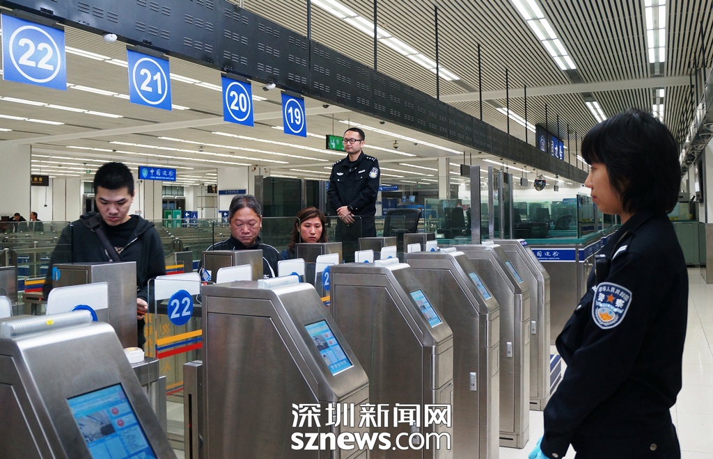 2月3日2:00,皇崗邊檢站十三隊(duì)分隊(duì)長云娜在皇崗口岸出境大廳自助查驗(yàn)通道監(jiān)護(hù)(通訊員 黃俊生攝)