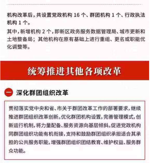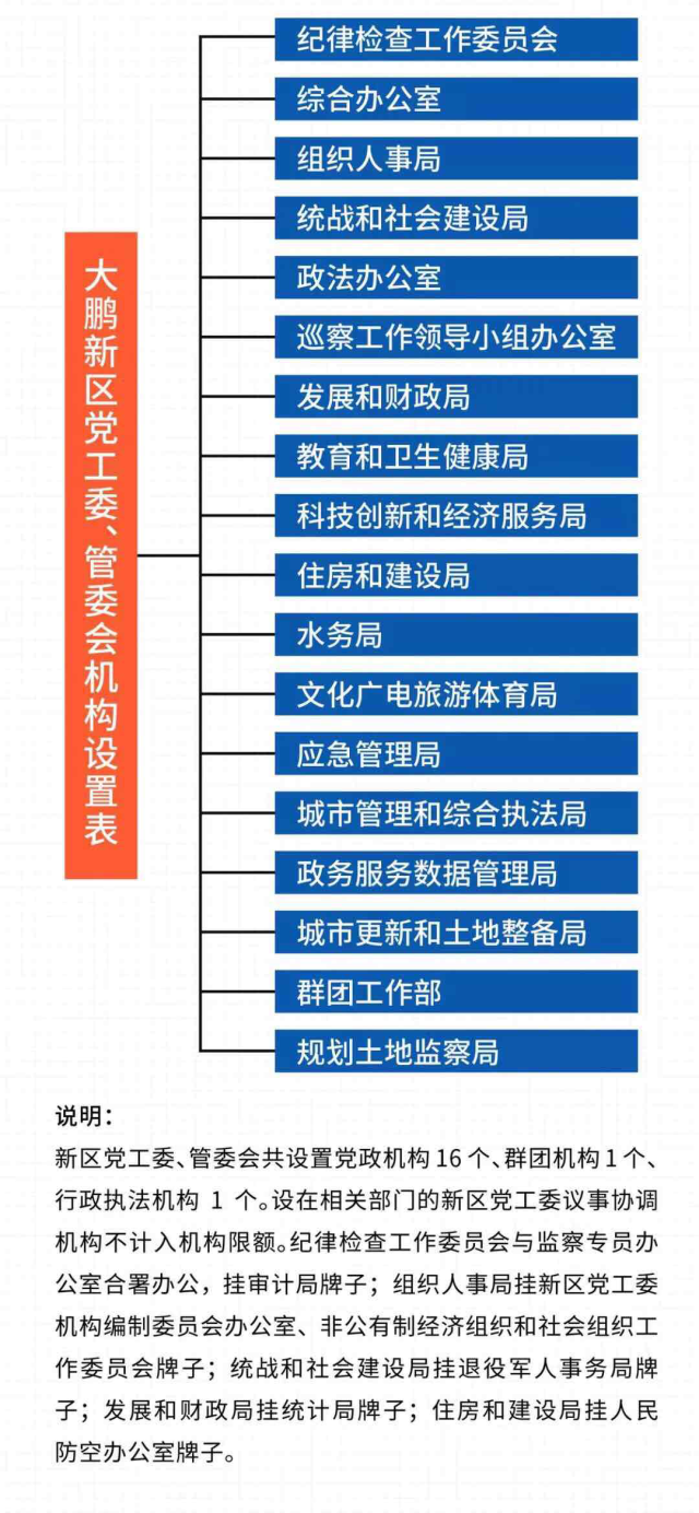 機構改革后,大鵬新區(qū)共設置黨政機構16個、群團機構1個、