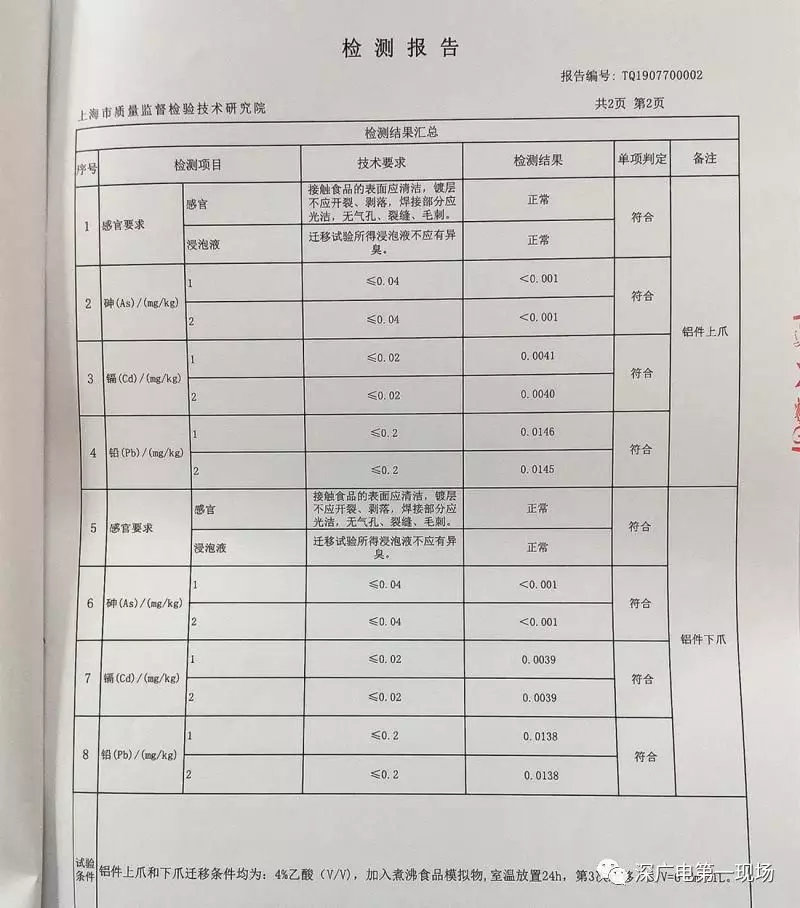 在現(xiàn)場,松江區(qū)市場監(jiān)管局還向記者出示了一份該局抽樣后委托上海市質(zhì)檢院進行檢測的檢測報告,檢測對象是“天使之橙”現(xiàn)榨橙汁機的上下爪,檢測依據(jù)就是上述的我國國家標準《食品接觸用金屬材料及制品》。經(jīng)檢測,相關(guān)部件的檢測項目均符合上述標準。