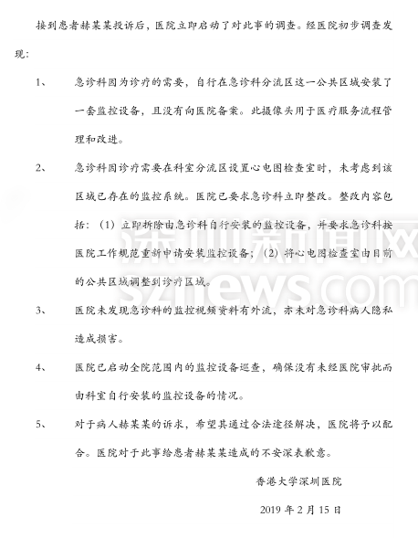 接到投訴后的港大深圳醫(yī)院,作出了以下回應:
