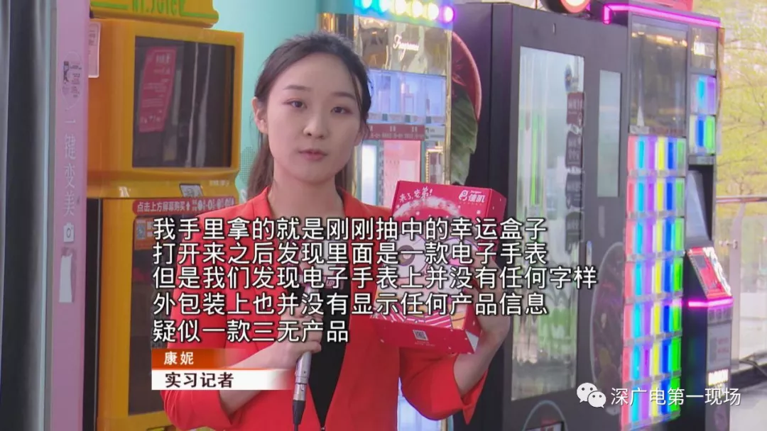 記者注意到,這家商場(chǎng)里擺放的除了口紅機(jī)外,還有所謂的“幸運(yùn)禮盒”機(jī),這個(gè)機(jī)器外型與自動(dòng)售貨機(jī)相似,游戲規(guī)則更加簡(jiǎn)單粗暴,只要掃碼付款三十元,就能得到一個(gè)幸運(yùn)禮盒。但禮盒里的獎(jiǎng)品卻讓記者大跌眼鏡。