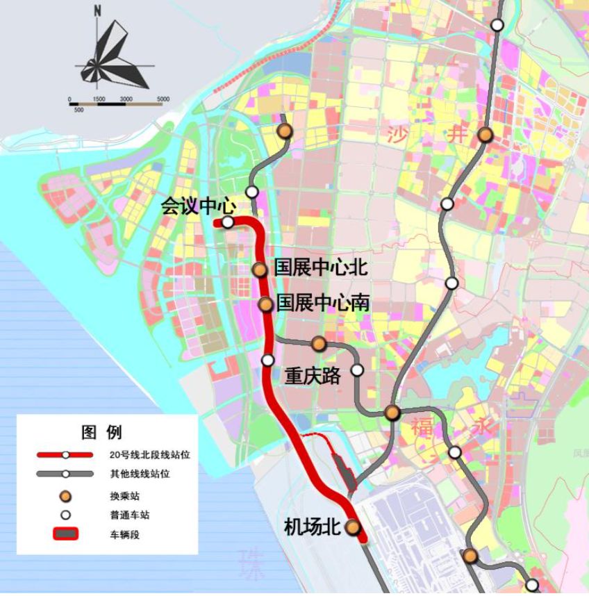 20號線北段起于寶安國際機場規(guī)劃 T4航站樓,在規(guī)劃 T4航站樓北側(cè),11號線東側(cè)設(shè)機場北站,與11號線、穗莞深城際線換乘。之后線路往北沿展覽大道敷設(shè),經(jīng)蠔業(yè)路后轉(zhuǎn)向北,于重慶路北側(cè),展覽大道東側(cè)設(shè)重慶路站。線路繼續(xù)往北,沿新會展中心東側(cè)道路敷設(shè),于景芳路南側(cè)設(shè)國展中心南站,與12號線換乘,在鳳塘大道路口設(shè)國展中心北站,與12號線、30號線換乘。線路自國展中心北站引出后,于和蕙路向東敷設(shè),于海濱大道東側(cè)設(shè)會議中心站。線路全長約8.4km,采用地下敷設(shè)。
