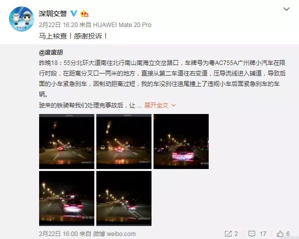 深圳新聞網(wǎng)2019年2月26日訊(記者 劉婷)據(jù)深圳交警權(quán)威發(fā)布消息,2019年2月22日下午16時22分,深圳交警收到微博網(wǎng)友舉報稱:2月21日18時55分,在北環(huán)大道南海立交路段,一輛廣州牌照小車在深圳限行時段,連續(xù)變道并壓導(dǎo)流線進(jìn)入輔道,導(dǎo)致后面兩車發(fā)生追尾事故。深圳交警立即對舉報信息進(jìn)行分析、經(jīng)過后臺系統(tǒng)查詢,與被舉報廣州車牌小車車主取得聯(lián)系,但車主稱不是其本人開車,而且人和車都在廣州,不方便來深圳處理。