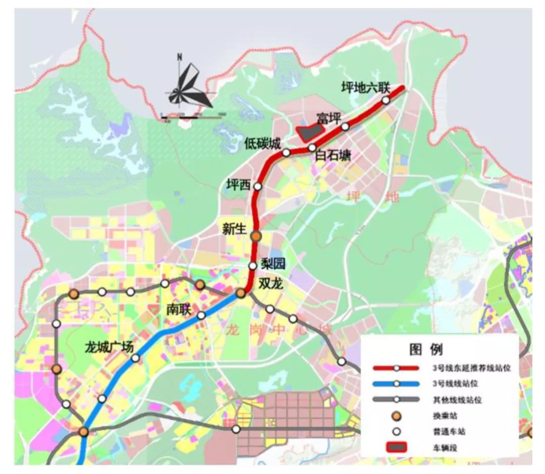 3號(hào)線東延線位于深圳市龍崗區(qū)境內(nèi),向東北方向延伸。線路全長(zhǎng)約9.4公里,其中地上線約2.0公里,地下線約7.4公里。