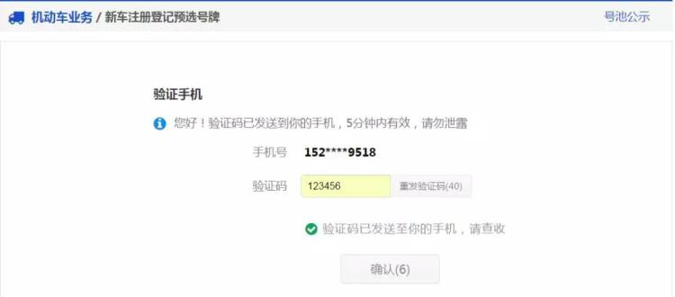 用戶須獲取并錄入手機短信驗證碼,驗證預(yù)選號牌的手機號碼。