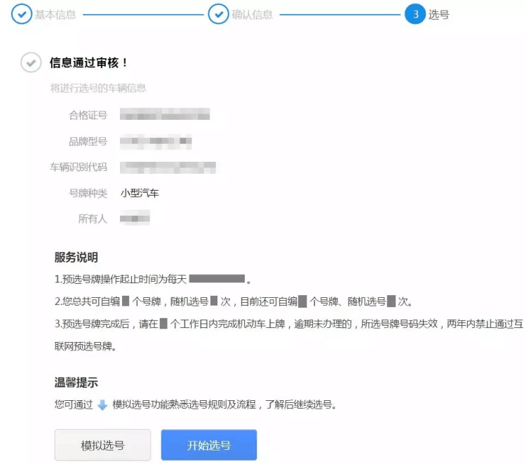 系統(tǒng)核查通過后會進入選號服務(wù)說明,用戶可以看到之前提交的信息,閱讀服務(wù)說明后,點擊"開始選號"按鈕開始進行選號操作。
