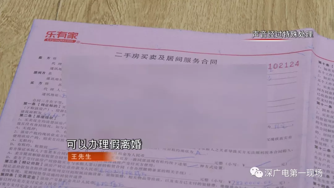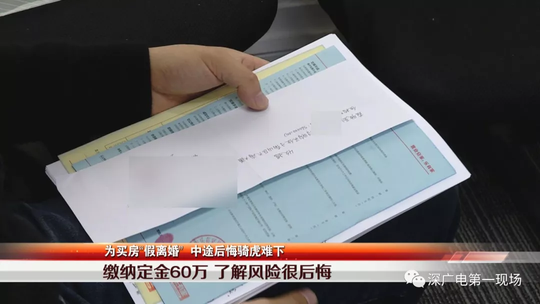 王先生:“中介說可以辦理假離婚,而且可以把假離婚手續(xù)辦到兩年前,首付就可以三成,我們當(dāng)時(shí)求房心切,就采取了信任對方?!?/p> 繳納定金60萬了解風(fēng)險(xiǎn)很后悔