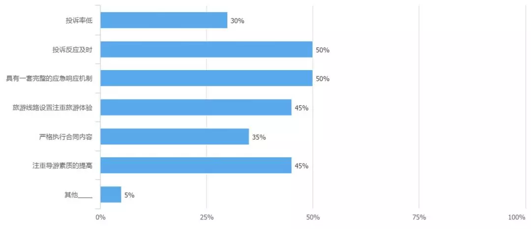 在眾多的旅游體驗(yàn)當(dāng)中,消費(fèi)者遇到的最主要的問題是強(qiáng)制購物、遭遇虛假宣傳、臨時(shí)更改旅游線路等問題,同時(shí)消費(fèi)者在選擇旅游線路時(shí),“野馬旅行社”、導(dǎo)游的服務(wù)態(tài)度、安全等問題也在重點(diǎn)考慮范圍內(nèi)。在改進(jìn)旅行社服務(wù)質(zhì)量方面,80%的消費(fèi)者認(rèn)為現(xiàn)狀需要政府和網(wǎng)絡(luò)共同關(guān)注,才能營造良好的旅游環(huán)境。旅行社對(duì)于投訴案例的反應(yīng)機(jī)制和反應(yīng)速度,之后也將成為消費(fèi)者在選擇旅行線路時(shí)的重要考量標(biāo)準(zhǔn)之一。