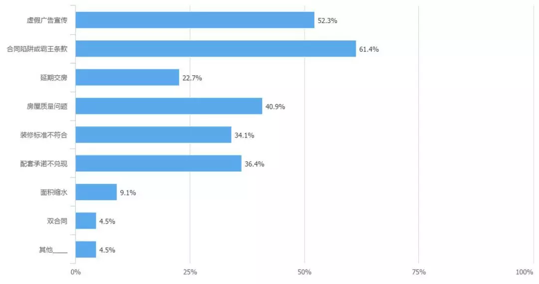 調(diào)查結(jié)果顯示,房產(chǎn)糾紛主要集中在購買一手房、二手房和房屋裝修上,分別占比38.6%、27.3%、27.3%,而且將近70%的消費(fèi)者對(duì)房產(chǎn)交易過程中的相關(guān)知識(shí)和風(fēng)險(xiǎn)只是了解一般。同時(shí),消費(fèi)者在新建商品房和二手房交易過程中遇到的糾紛在問卷結(jié)果中顯示都是多方面的。其中,新建商品房交易陷阱主要是“合同陷阱或霸王條款”、“虛假廣告宣傳”;二手房交易陷阱主要是“隱瞞房屋缺陷”。針對(duì)如何避免購房糾紛,50%以上的消費(fèi)者認(rèn)為“購房前咨詢朋友、專家”和“購房前多學(xué)習(xí)房產(chǎn)知識(shí),防止受騙”是最好的辦法。