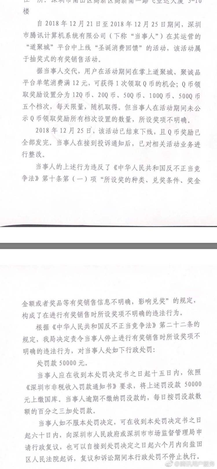 為解答網(wǎng)友疑惑,當(dāng)天晚間,微博賬號騰訊用戶服務(wù)公開發(fā)布了該處罰決定書,決定書中提到,2018年12月21日 -25日期間,深圳市騰訊計(jì)算機(jī)系統(tǒng)有限公司(下稱"當(dāng)事人")在其運(yùn)營的"道聚城"平臺中上線"圣誕消費(fèi)回饋"的活動(dòng),該活動(dòng)屬于抽獎(jiǎng)式的有獎(jiǎng)銷售活動(dòng)。