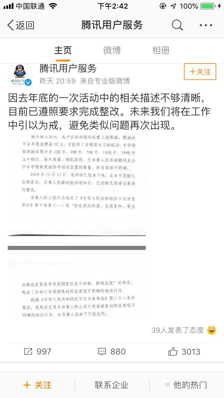 3月20日,微博認(rèn)證為騰訊公司公關(guān)總監(jiān)張軍在微博中解釋:因去年年底的一次活動(dòng)中的相關(guān)描述不夠清晰,目前已遵照要求完成整改。未來我們將在工作中引以為戒,避免類似問題再次出現(xiàn)。