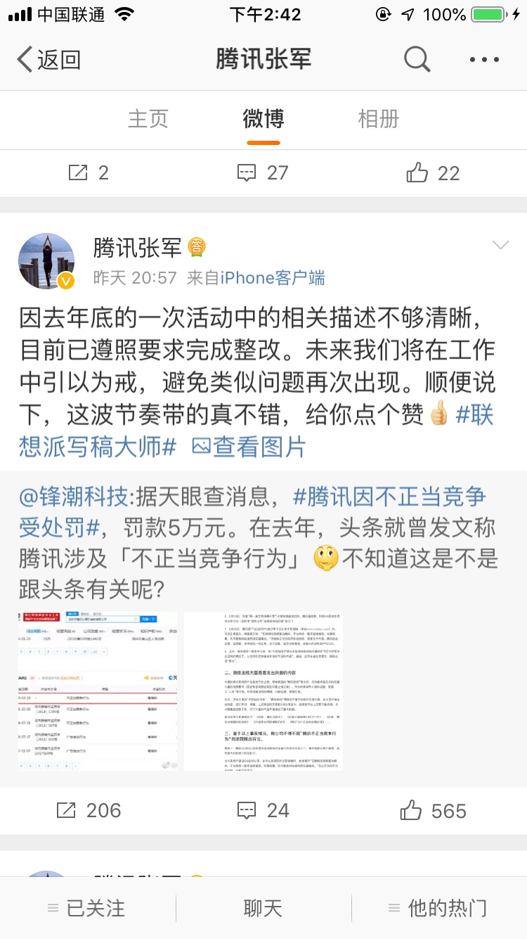 數(shù)據(jù)顯示,騰訊在前兩次受到行政處罰的類型均為不正當(dāng)競爭。微博賬號 @鋒潮科技發(fā)文稱,去年,今日頭條就曾發(fā)文稱騰訊設(shè)計(jì)不正當(dāng)競爭行為,不知道這是不是跟頭條有關(guān)。對該揣測,張軍還在微博中調(diào)侃工作人員不早公布緣由,導(dǎo)致該事件被人帶節(jié)奏。