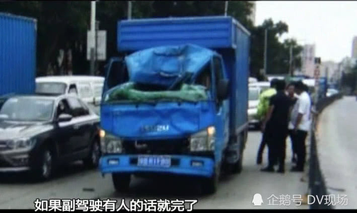 隨后裝竹子的前車開(kāi)到斑馬線前突然剎車,緊跟其后的另一輛貨車剎車不及直接撞上,竹子直接插穿了后車的駕駛室,隨即車頭碎片橫飛,駕駛室嚴(yán)重變形。