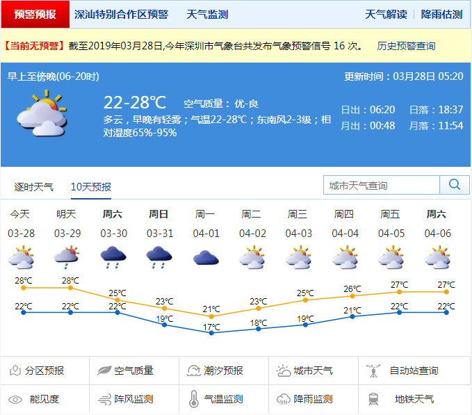 深圳新聞網(wǎng)2019年3月28日訊 深圳今日多云,早晚有輕霧或霧;20-27℃;南風(fēng)2-3級;濕度60%-95%。預(yù)計29日多云轉(zhuǎn)陣雨;30-31日冷空氣影響,陰天有陣雨或雷陣雨,天氣轉(zhuǎn)涼;4月1日陰轉(zhuǎn)多云,偶有零星小雨;2日起氣溫逐日回升。