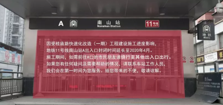 乘客們也請注意:11號線南山站A出入口延長封閉時間至2020年4月