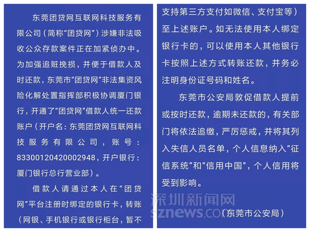 東莞警方開設統(tǒng)一還款賬戶敦促“團貸網”借款人還款