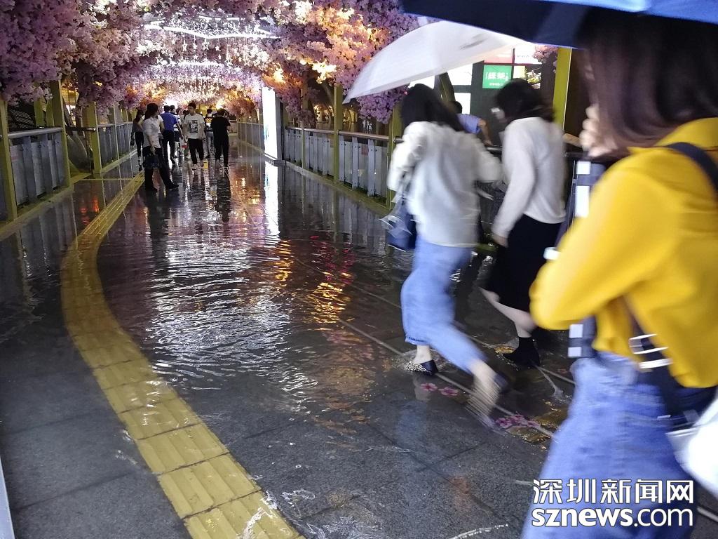 深圳暴雨特效開啟,市民紛紛進(jìn)入躲雨模式。(記者 邱曉潔 攝于丹竹頭地鐵站)
